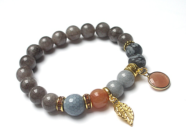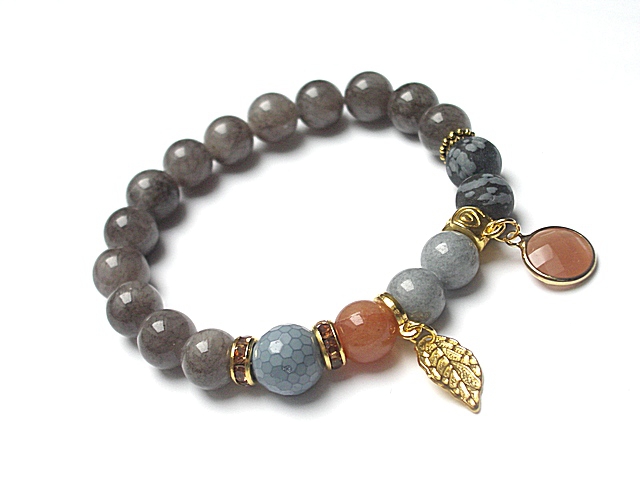 PROJEKT AUTORSKI. WŁASNOŚĆ KI-KA. KOPIOWANIE ZABRONIONE. Bransoletka z kolekcji RICH charakteryzującej się wykorzystaniem w jednej bransoletce - mixu minerałów, kryształków, elementów ozdobnych, kryształków Swarovskiego, cyrkonii, przywieszek etc. Model jest w sam sobie na tyle strojny, że nie wymaga uzupełnienia go dodatkowymi akcentami. Bransoletka wykonana z naturalnych kamieni - obsydian matowy [10mm], marmur [10mm], awenturyn [10mm], agat fasetowany [12mm], zawieszki ze szkła oraz elementów metalowych w kolorze złota. Bransoletka na gumce silikonowej. Pasuje na nadgarstek 16-17cm. Biżuteria ozdobnie zapakowana. Możliwość dopasowania bransoletki do nadgarstka - wcześniej prosimy o kontakt.