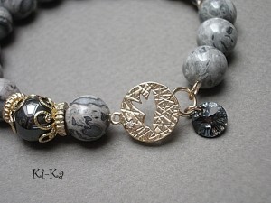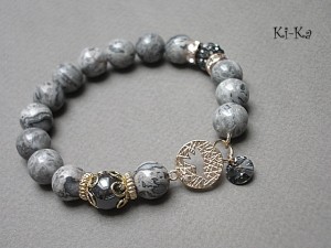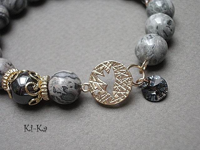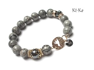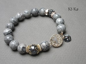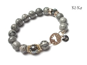 PROJEKT AUTORSKI. WŁASNOŚĆ KI-KA. KOPIOWANIE ZABRONIONE. Bransoletka z kolekcji RICH charakteryzującej się wykorzystaniem w jednej bransoletce - mixu minerałów, kryształków, elementów ozdobnych, kryształków Swarovskiego, cyrkonii, przywieszek etc. . Model jest w sam sobie na tyle strojny, że nie wymaga uzupełnienia go dodatkowymi akcentami. Bransoletka wykonana z kamieni naturalnych - jaspis [10mm], hematyt [10mm], zawieszki z kryształkiem Swarovskiego, przekładki shamballa wysadzanej kryształkami [10mm], łącznika z motywem ptaka z wtopioną cyrkonią oraz elementów metalowych w kolorze tzw. różowego złota. Bransoletka na gumce silikonowej. Pasuje na nadgarstek 16-17cm. Biżuteria ozdobnie zapakowana. Możliwość dopasowania bransoletki do nadgarstka - wcześniej prosimy o kontakt.