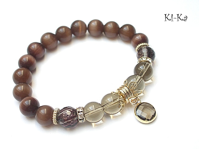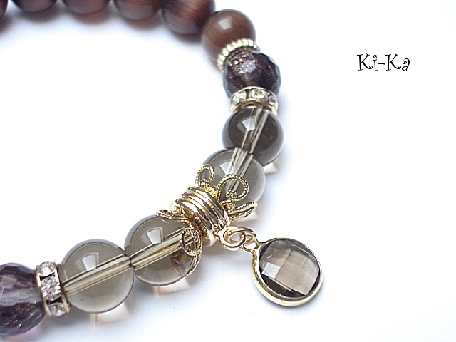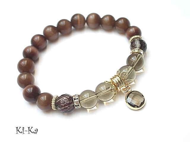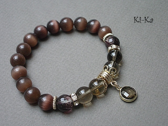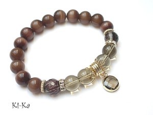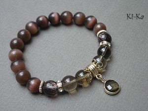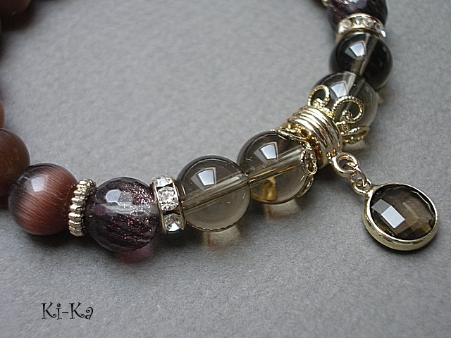 PROJEKT AUTORSKI. KOPIOWANIE ZABRONIONE. Bransoletka z kolekcji "RICH" charakteryzującej się wykorzystaniem w jednej bransoletce - mixu minerałów, kryształków, elementów ozdobnych, kryształków Swarovskiego, cyrkonii, przywieszek etc. . Model jest w sam sobie na tyle strojny, że nie wymaga uzupełnienia go dodatkowymi akcentami. Bransoletka wykonana z kamieni naturalnych -kwarc dymny [10mm], uleksyt [10mm],,fasetowane kuleczki kwarców ze złotymi drobinkami [10mm] ,efektownej zawieszki w okuciu oraz elementów w kolorze złota. Bransoletka na gumce silikonowej. Pasuje na nadgarstek 15,5-16,5cm. Biżuteria ozdobnie zapakowana. Możliwość dopasowania bransoletki do nadgarstka - wcześniej prosimy o kontakt.