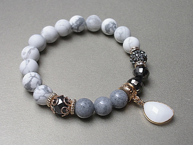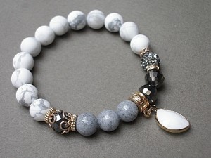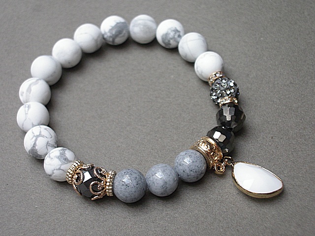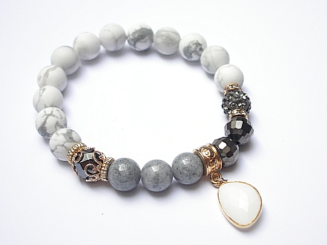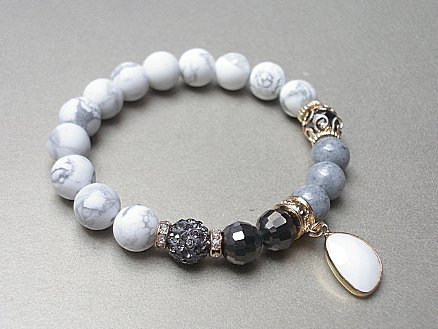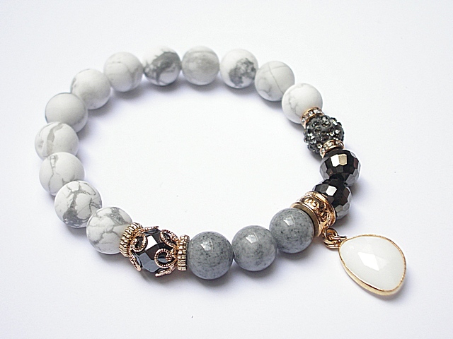 PROJEKT AUTORSKI. Bransoletka z kolekcji "RICH" charakteryzującej się wykorzystaniem w jednej bransoletce - mixu minerałów, kryształków, elementów ozdobnych, kryształków Swarovskiego, cyrkonii, przywieszek etc. . Model jest w sam sobie na tyle strojny, że nie wymaga uzupełnienia go dodatkowymi akcentami. Bransoletka wykonana z kamieni naturalnych - matowy howlit [10mm], marmur [10mm] , fasetowany hematyt [10mm], kryształków fasetowanych [10mm], efektownej przywieszki, kuleczki shamballa wysadzanej kryształkami Swarovskiego oraz elementów w kolorze złota. Bransoletka na gumce silikonowej. Pasuje na nadgarstek 16-17cm. Biżuteria ozdobnie zapakowana. Możliwość dopasowania bransoletki do nadgarstka - wcześniej prosimy o kontakt.