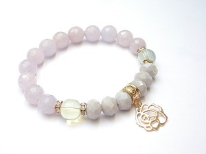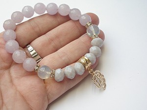 PROJEKT AUTORSKI. Bransoletka z kolekcji "RICH" charakteryzującej się wykorzystaniem w jednej bransoletce - mixu minerałów, kryształków, elementów ozdobnych, kryształków Swarovskiego, cyrkonii, przywieszek etc. . Model jest w sam sobie na tyle strojny, że nie wymaga uzupełnienia go dodatkowymi akcentami. Bransoletka wykonana z naturalnych kamieni - jadeity fasetowane [10mm], kryształki fasetowane [10 x 8mm], szkło [10mm] oraz elementów w kolorze tzw. różowego złota. Bransoletka na gumce silikonowej. Pasuje na nadgarstek 16-17cm. Biżuteria ozdobnie zapakowana. Możliwość dopasowania bransoletki do nadgarstka - wcześniej prosimy o kontakt.
