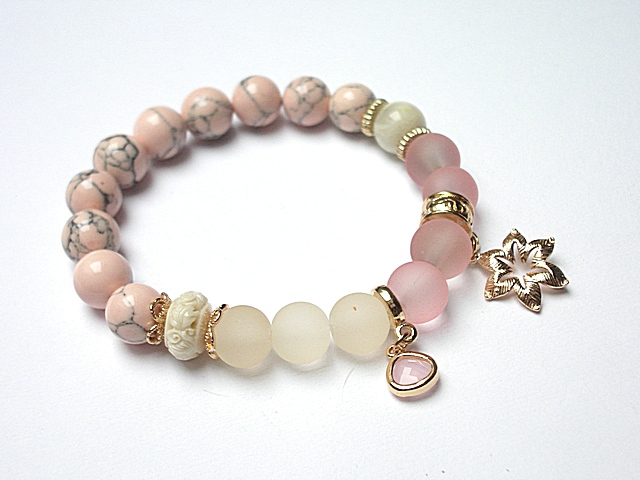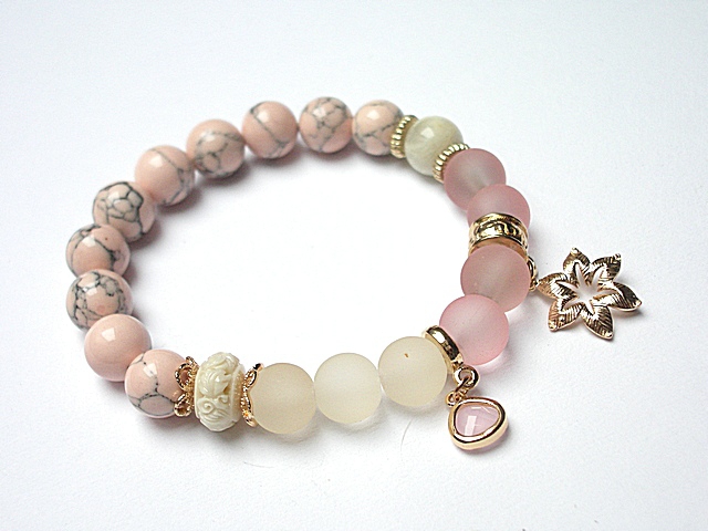 PROJEKT AUTORSKI. Bransoletka z kolekcji "RICH" charakteryzującej się wykorzystaniem w jednej bransoletce - mixu minerałów, kryształków, elementów ozdobnych, kryształków Swarovskiego, cyrkonii, przywieszek etc. . Model jest w sam sobie na tyle strojny, że nie wymaga uzupełnienia go dodatkowymi akcentami. Bransoletka wykonana z naturalnych kamieni - howlit [10mm], kamień księżycowy [10mm], szkła matowego [10mm], przekładki z rzeźbionego naturalnego korala, efektownej zawieszki ze szkła oraz elementów w kolorze tzw. różowego złota. Bransoletka na gumce silikonowej. Pasuje na nadgarstek 16- 17cm. Biżuteria ozdobnie zapakowana. Możliwość dopasowania bransoletki do nadgarstka - wcześniej prosimy o kontakt.