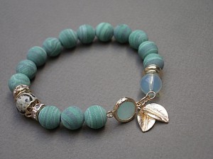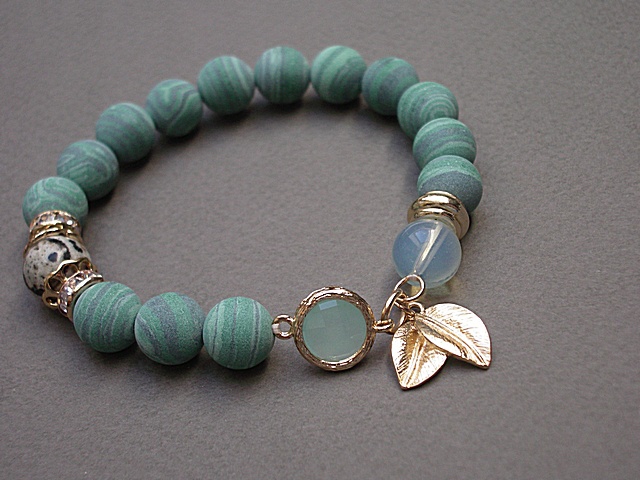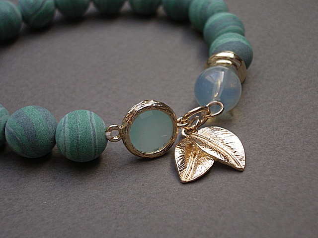 PROJEKT AUTORSKI. WŁASNOŚĆ KI-KA. KOPIOWANIE ZABRONIONE. Bransoletka z kolekcji RICH charakteryzującej się wykorzystaniem w jednej bransoletce - mixu minerałów, kryształków, elementów ozdobnych, kryształków Swarovskiego, cyrkonii, przywieszek etc. . Model jest w sam sobie na tyle strojny, że nie wymaga uzupełnienia go dodatkowymi akcentami. Bransoletka wykonana z kuleczek matowych turkusów prasowych [10mm], jaspisu {10mm], szklanej kuleczki [10mm], efektownego łącznika w okuciu oraz elementów w kolorze różowego złota. Bransoletka na gumce silikonowej. Pasuje na nadgarstek 16-17cm. Biżuteria ozdobnie zapakowana. Możliwość dopasowania bransoletki do nadgarstka - wcześniej prosimy o kontakt.
