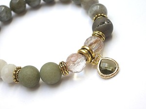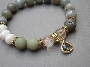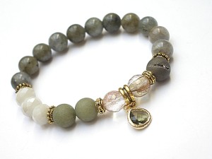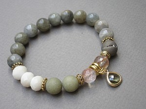 PROJEKT AUTORSKI. WŁASNOŚĆ KI-KA. KOPIOWANIE ZABRONIONE. Bransoletka z kolekcji RICH charakteryzującej się wykorzystaniem w jednej bransoletce - mixu minerałów, kryształków, elementów ozdobnych, kryształków Swarovskiego, cyrkonii, przywieszek etc. . Model jest w sam sobie na tyle strojny, że nie wymaga uzupełnienia go dodatkowymi akcentami. Bransoletka wykonana z naturalnych kamieni - labradoryty [10mm], agat z widocznymi druzami pokrytymi tytanem [10mm], kwarc z drobinkami złota [10mm], jadeit matowy [10mm], kryształków fasetowanych [8 x 10mm], efektownej zawieszki ze szkła oraz elementów metalowych w kolorze srebra. Bransoletka na gumce silikonowej. Pasuje na nadgarstek 16-17cm. Biżuteria ozdobnie zapakowana. Możliwość dopasowania bransoletki do nadgarstka - wcześniej prosimy o kontakt.