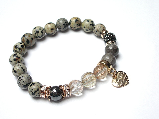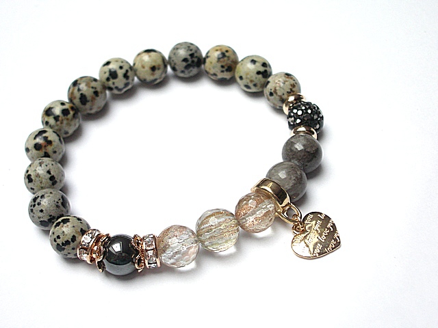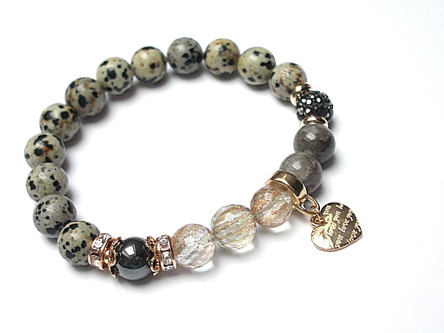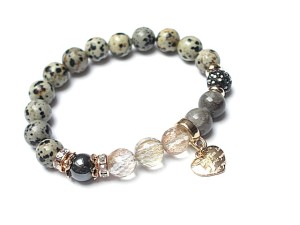 PROJEKT AUTORSKI. Bransoletka z kolekcji "RICH" charakteryzującej się wykorzystaniem w jednej bransoletce - mixu minerałów, kryształków, elementów ozdobnych, kryształków Swarovskiego, cyrkonii, przywieszek etc. . Model jest w sam sobie na tyle strojny, że nie wymaga uzupełnienia go dodatkowymi akcentami. Bransoletka wykonana z kamieni naturalnych - jaspis [10mm], marmur [10mm], kwarc z drobinkami złota [10mm], hematyt [10mm], kuleczki shamballa wysadzanej kryształkami Swarovskiego [10mm] oraz elementów w kolorze tzw. różowego złota. Bransoletka na gumce silikonowej. Pasuje na nadgarstek 16-17cm. Biżuteria ozdobnie zapakowana. Możliwość dopasowania bransoletki do nadgarstka - wcześniej prosimy o kontakt.