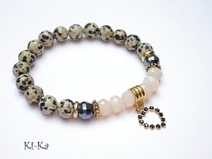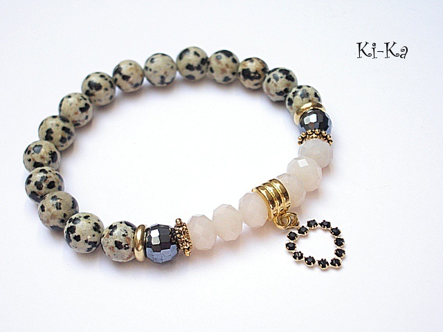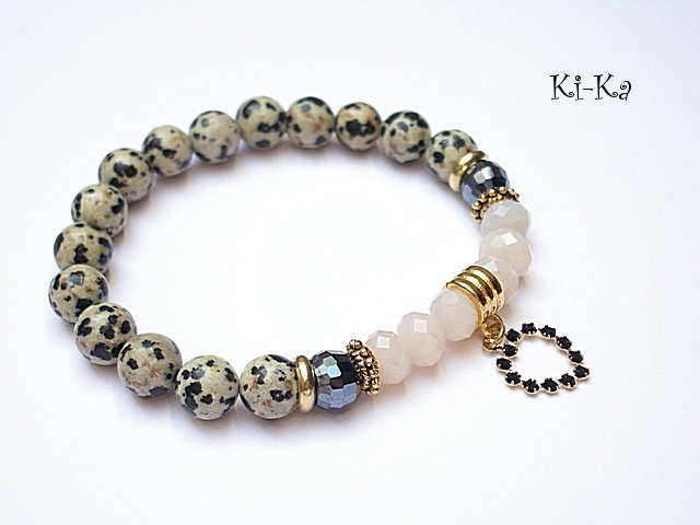 PROJEKT AUTORSKI. Bransoletka z kolekcji "RICH" charakteryzującej się wykorzystaniem w jednej bransoletce - mixu minerałów, kryształków, elementów ozdobnych, kryształków Swarovskiego, cyrkonii, przywieszek etc. . Model jest w sam sobie na tyle strojny, że nie wymaga uzupełnienia go dodatkowymi akcentami. Bransoletka wykonana z naturalnych kamieni - jaspisu dalmatyńczyk [8mm] kryształków [8 mm], zawieszki -serca z metalu pokrytego srebrem [pr.925] pozłoconego 18k złotem i wysadzanego kryształkami Swarovskiego oraz elementów w kolorze złota. Bransoletka na gumce silikonowej. Pasuje na nadgarstek 15,5-17cm. Biżuteria ozdobnie zapakowana. Możliwość dopasowania bransoletki do nadgarstka - wcześniej prosimy o kontakt.