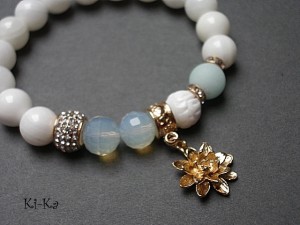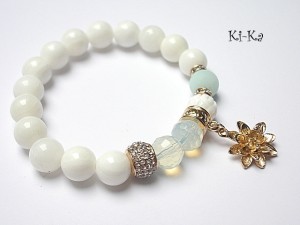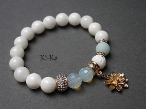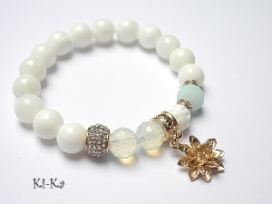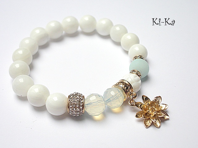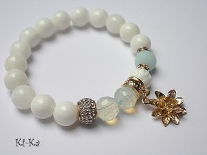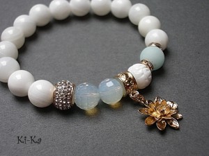 PROJEKT AUTORSKI. Bransoletka z kolekcji "RICH" charakteryzującej się wykorzystaniem w jednej bransoletce - mixu minerałów, kryształków, elementów ozdobnych, kryształków Swarovskiego, cyrkonii, przywieszek etc. . Model jest w sam sobie na tyle strojny, że nie wymaga uzupełnienia go dodatkowymi akcentami. Bransoletka wykonana z naturalnych kamieni - jadeity [10mm], muszli [10mm], naturalnego, rzeźbionego korala [10mm], kryształków [10mm], przekładek wysadzanych kryształkami, przekładki wysadzanej cyrkoniami oraz elementów w kolorze tzw. różowego złota. Bransoletka na gumce silikonowej. Pasuje na nadgarstek 15,5-17cm. Biżuteria ozdobnie zapakowana. Możliwość dopasowania bransoletki do nadgarstka - wcześniej prosimy o kontakt. Bransoletka może stanowić komplet z innymi modelami - przykładowe zdjęcia.