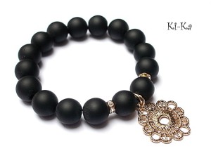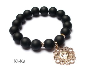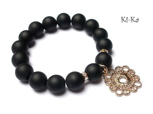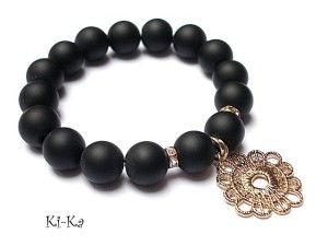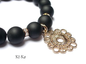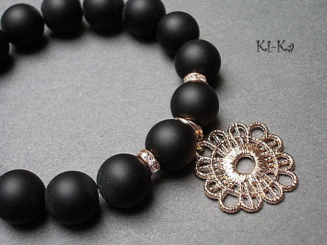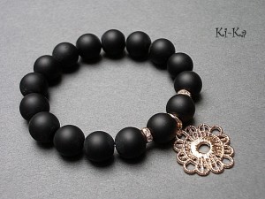 Bransoletka wykonana z kamieni naturalnych - black stone [12mm], przekładek wysadzanych kryształkami oraz elementów w kolorze różowego złota. Bransoletka na gumce silikonowej. Pasuje na nadgarstek 15,5-16,5cm. Biżuteria ozdobnie zapakowana. Do kompletu można dokupić kolczyki - zdjęcia