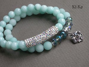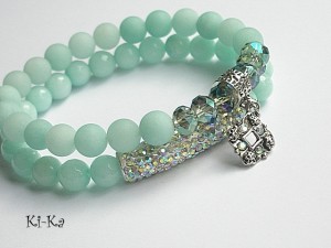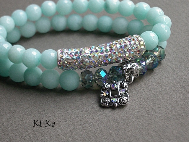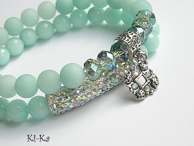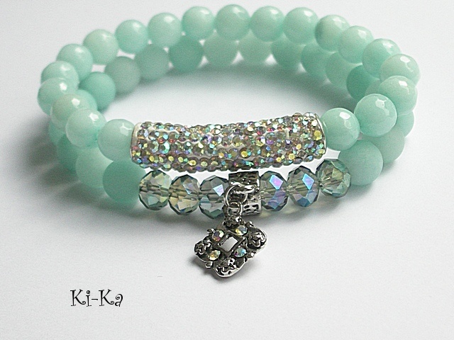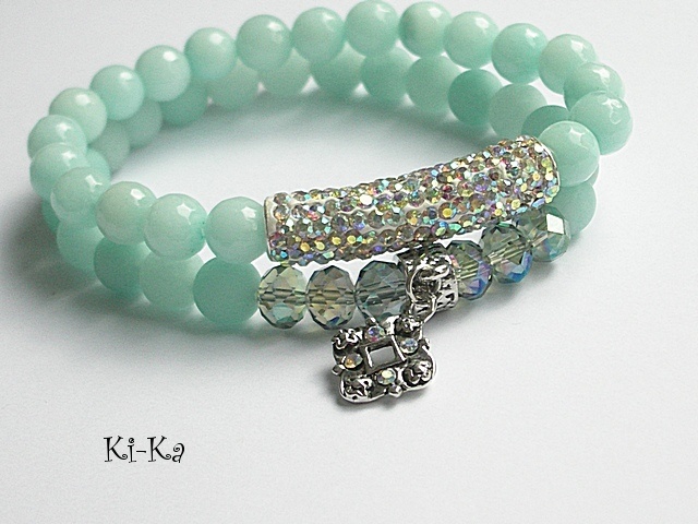 Komplet dwóch bransoletek wykonanych z naturalnych kamieni - matowe kule jadeitów [8mm], jadeity gloss [8mm], kryształków [szkło bardzo dobrej jakości] elementów w kolorze srebra oraz przekładek wysadzanych kryształkami. Bransoletki pasują na nadgarstek 15 - 16,5cm. Biżuteria ozdobnie zapakowana. Możliwość dopasowania bransoletek do nadgarstka - wcześniej prosimy o kontakt.