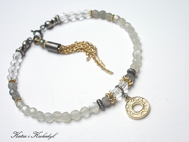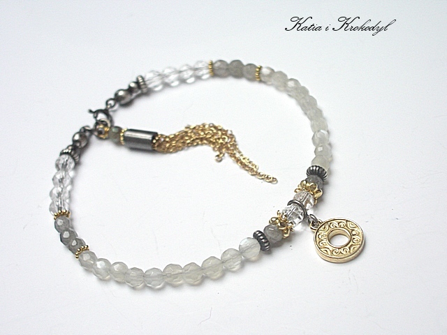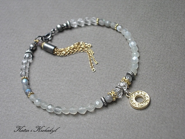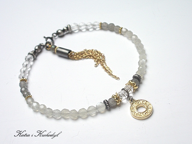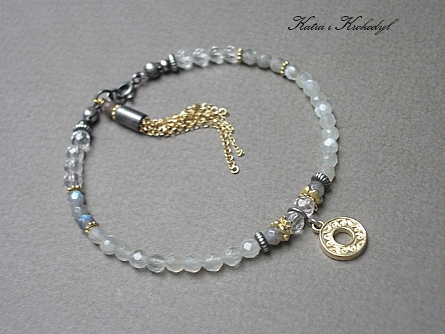 PRODUKT MARKI KATIA I KROKODYL. Bransoletka wykonana w całości ze srebra i srebra pokrytego 24k złotem [pr. 925] w połączeniu z fasetowanymi kuleczkami kamieni księżycowych [4mm], fasetowanymi kuleczkami labradorytów [4mm], kuleczkami kryształów górskich [4mm] oraz chwostem z łańcuszków. Srebro częściowo oksydowane i przetarte. Całkowita długość bransoletki 19,5cm. Biżuteria ozdobnie zapakowana