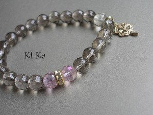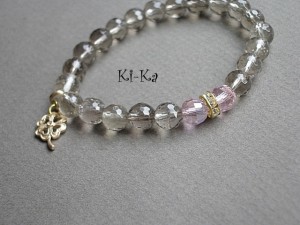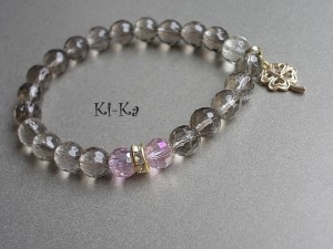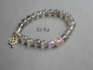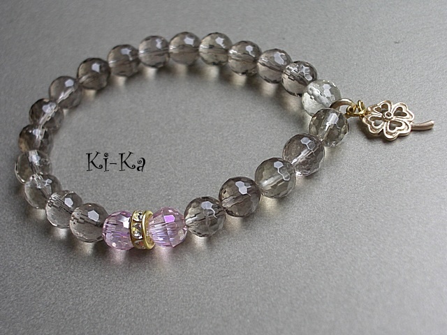 Bransoletka wykonana z fasetowanych kuleczek kwarcu dymnego [8mm], kryształków w kolorze różowym z lekkim efektem ab [8mm, szkło bardzo dobrej jakości] oraz elementy metalowe w kolorze złota . Bransoletka na gumce silikonowej. Pasuje na nadgarstek 15 - 16,5cm. Biżuteria ozdobnie zapakowana