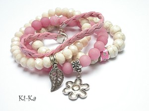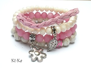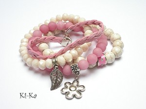 Komplet czterech bransoletek wykonanych z naturalnych kamieni: kuleczki howlitów [10mm] ,kuleczki matowych jadeitów [8mm] ,szklanych kryształków [8mm] , plecionego rzemienia ze skórki ekologicznej [szer. 6mm] oraz elementów metalowych w kolorze srebrnym. Bransoletki pasują na nadgarstek 15,5 - 16,5cm. Biżuteria ozdobnie zapakowana.