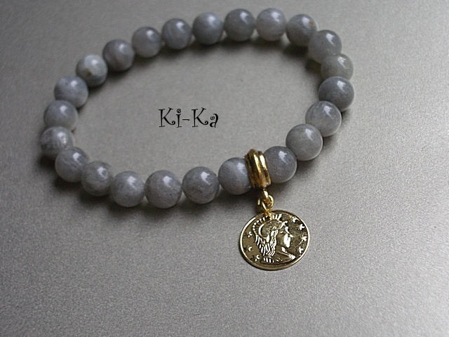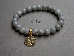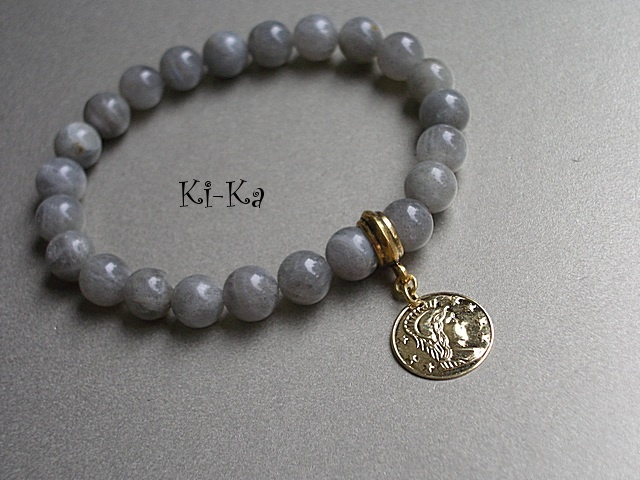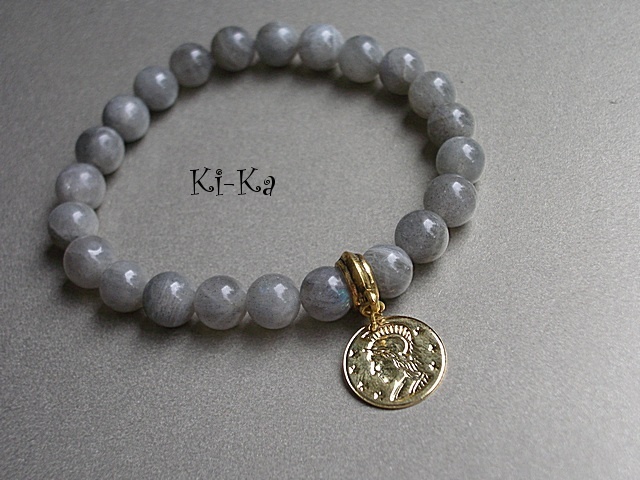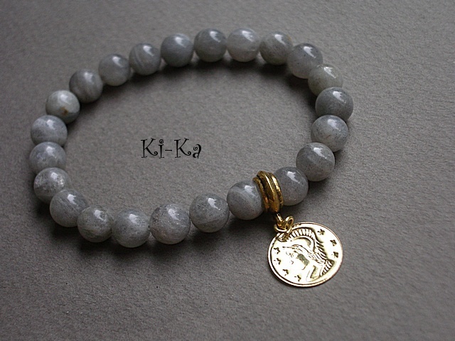 Bransoletka wykonana z naturalnych minerałów - labradoryt [8mm] oraz elementów w kolorze złota. Bransoletka na gumce silikonowej. Pasuje na nadgarstek 15-16cm. Biżuteria ozdobnie zapakowana Bransoletka może stanowić komplet z innymi bransoletkami dostępnym w naszej galerii - przykładowe zdjęcia.