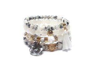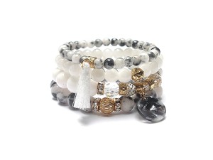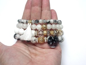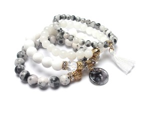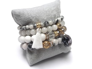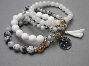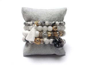 Komplet czterech bransoletek wykonanych z naturalnych kamieni: jadeity [10mm, 8mm i 6mm], kryształki [10mm i 8mm], zawieszki z żywicy, chwosta oraz elementów metalowych w kolorze złota. Bransoletki pasują na nadgarstek 16-16,5cm. Biżuteria ozdobnie zapakowana.