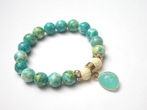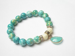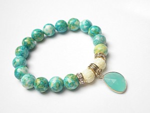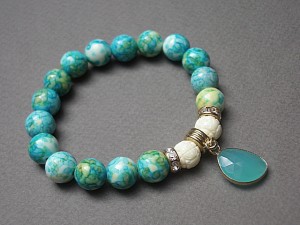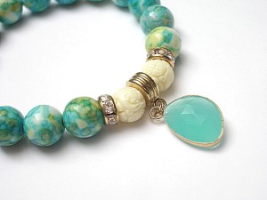Bransoletka wykonana z naturalnych kamieni - howlit [10mm], muszla rzeźbiona [10mm] , zawieszki ze szkła oraz elementów metalowych w kolorze tzw. różowego złota. Bransoletka na gumce silikonowej. Pasuje na nadgarstek 16-17cm. Biżuteria ozdobnie zapakowana. Możliwość dopasowania bransoletki do nadgarstka - wcześniej prosimy o kontakt.