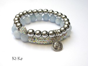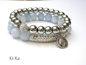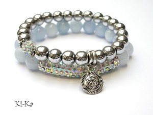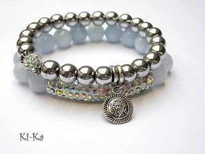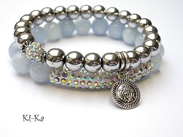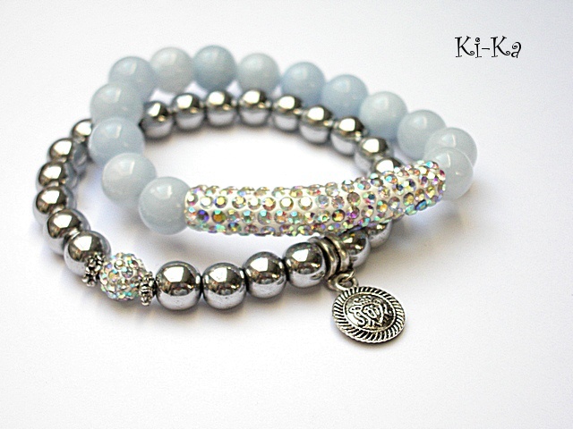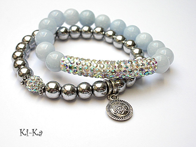 Komplet dwóch bransoletek wykonanych z naturalnych minerałów: jadeity [10mm], hematyty [8mm] ekskluzywnej tuby wysadzanej kryształkami, kuleczki shamballa wysadzanej kryształkami Swarovskiego oraz elementów metalowych w kolorze srebra. Bransoletki pasują na nadgarstek 15,5 - 16,5cm. Biżuteria ozdobnie zapakowana.