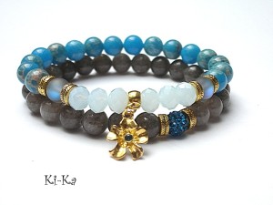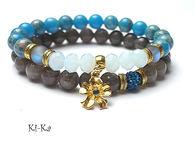 PROJEKT AUTORSKI.WŁASNOŚĆ KI-KA.KOPIOWANIE ZABRONIONE. Komplet dwóch bransoletek wykonany z naturalnych kamieni - howlit [8mm], kwarc matowy mystic [8mm], fasetowanych kryształków [8 x 6mm], przywieszki z cyrkonią ,kuleczki shamballa [8mm] ,marmuru [8mm] oraz elementów w kolorze złota. Bransoletka na gumce silikonowej. Pasuje na nadgarstek 16-17cm. Biżuteria ozdobnie zapakowana. Możliwość dopasowania bransoletki do nadgarstka - wcześniej prosimy o kontakt.