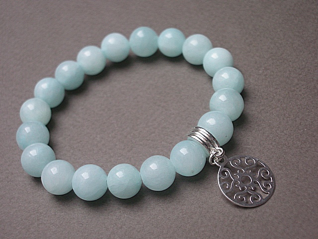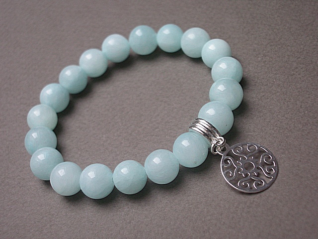 Bransoletka wykonana z kamieni naturalnych - jadeity [10mm], zawieszki z platerowanego, posrebrzanego mosiądzu oraz przekładki metalowej w kolorze srebra. Bransoletka na gumce silikonowej. Pasuje na nadgarstek 16-17cm. Biżuteria ozdobnie zapakowana. Możliwość dopasowania bransoletki do nadgarstka - wcześniej prosimy o kontakt.