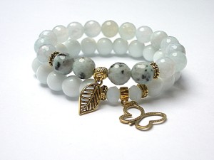 PROJEKTY AUTORSKIE. WŁASNOŚĆ KI-KA. Komplet dwóch bransoletek wykonany z naturalnych kamieni - jaspis fasetowany [10mm], agaty fasetowane [10mm], jadeity [10mm], kryształków fasetowanych [6 x 8mm] oraz elementów metalowych w kolorze złota. Bransoletki pasują na nadgarstek 16 -17cm. Bransoletki na gumce silikonowej. Biżuteria ozdobnie zapakowana
