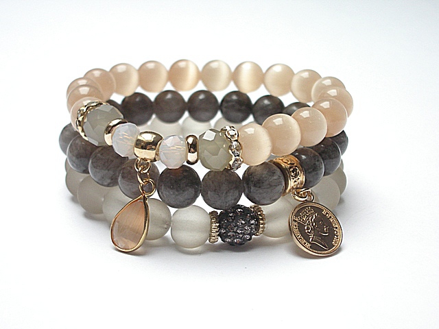 PROJEKT AUTORSKI. WŁASNOŚĆ KI-KA. KOPIOWANIE ZABRONIONE. Komplet trzech bransoletek wykonanych z naturalnych kamieni: uleksyt [10mm], marmur [10mm], szkła matowego [10mm], kryształków fasetowanych [10 x 8mm oraz 6 x 8mm], przekładki shamballa wysadzanej kryształkami Swarovskiego [10mm] przywieszki szklanej w okuciu oraz elementów metalowych w kolorze złota. Bransoletki pasują na nadgarstek 16-17cm.Biżuteria ozdobnie zapakowana