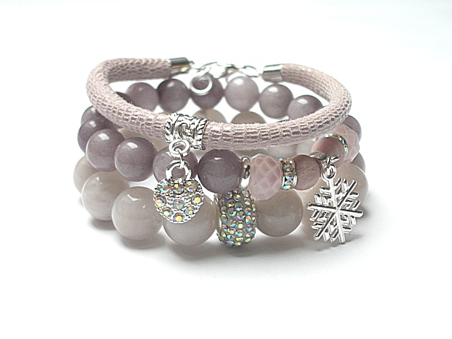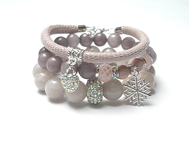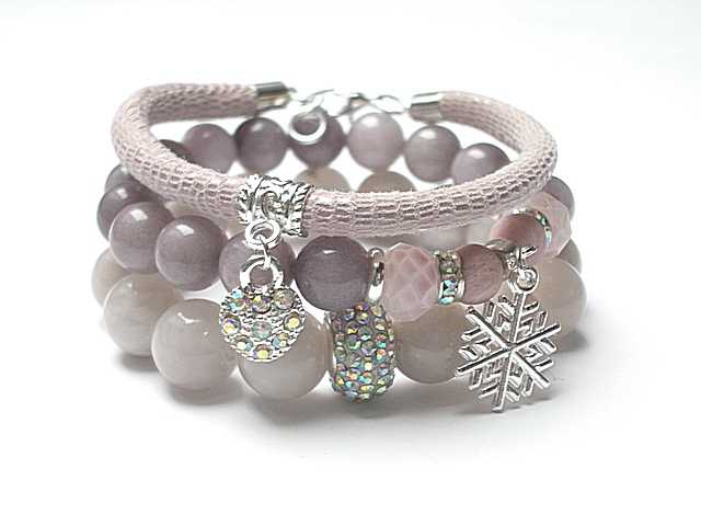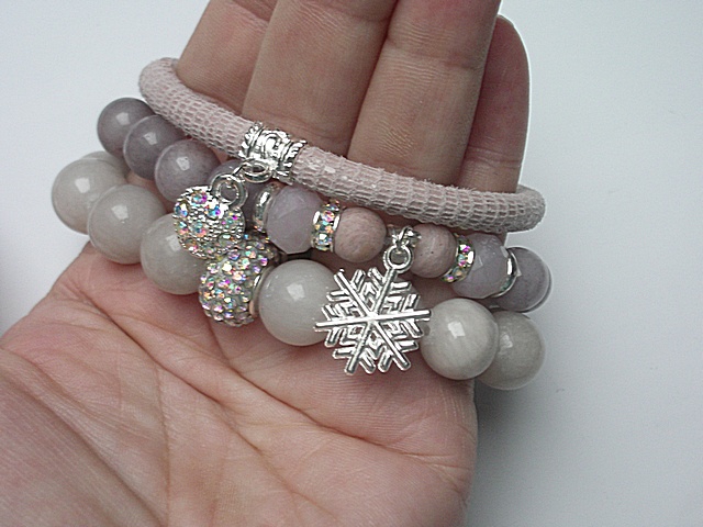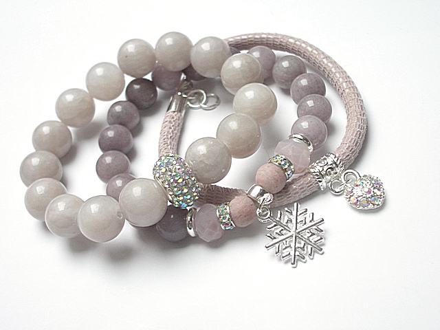 PROJEKT AUTORSKI. WŁASNOŚĆ KI-KA. KOPIOWANIE ZABRONIONE. Komplet trzech bransoletek wykonany z naturalnych kamieni - jadeity [10 i 12mm], rodonitów matowych [8mm], kryształków fasetowanych [8 x 10mm], rzemienia z naturalnej, miękkiej, koziej skórki [śr. 5mm] oraz elementów metalowych w kolorze srebra. Bransoletki z kamieni na gumce silikonowej. Pasują na nadgarstek 16-17cm. Biżuteria ozdobnie zapakowana. Możliwość dopasowania bransoletki do nadgarstka - wcześniej prosimy o kontakt.