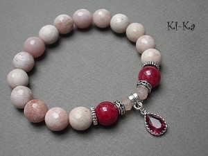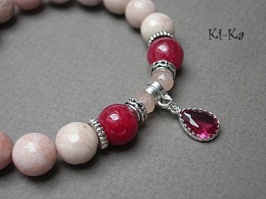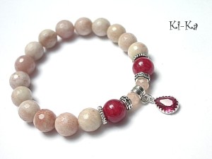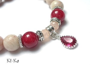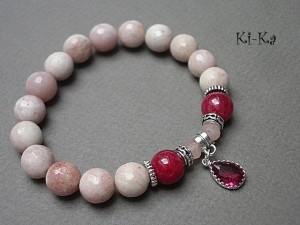 PROJEKTY AUTORSKIE. WŁASNOŚĆ KI-KA. KOPIOWANIE ZABRONIONE, Bransoletka wykonana z naturalnych kamieni - kamień słoneczny fasetowany [10mm], jadeity [10mm], kryształków fasetowanych [6 x 4mm], efektownej zawieszki ze szkła w oprawie koronkowej oraz elementów metalowych kolorze srebra. Bransoletka na gumce silikonowej. Będzie pasowała na nadgarstek 16-17cm. Biżuteria ozdobnie zapakowana.