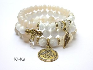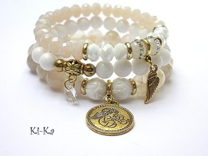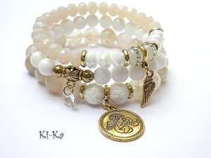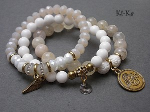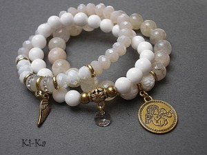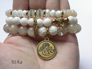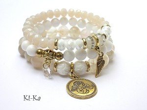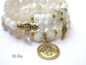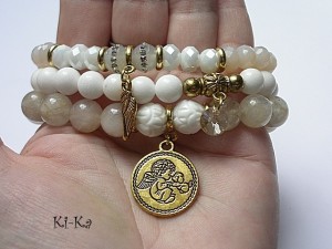 Komplet trzech bransoletek wykonany z kamieni naturalnych - jadeity [8mm], kwarc z rutylem[10mm], naturalnego, rzeźbionego korala [10mm], agatów wysadzanych cyrkoniami [8mm], przywieszki z kryształkiem Swarovskiego, kryształków [8 x 6mm] oraz elementów w kolorze złota. Pasują na nadgarstek 15,5-16,5cm. Bransoletki na gumce silikonowej. Biżuteria ozdobnie zapakowana