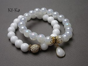 Komplet dwóch bransoletek wykonany z naturalnych kamieni - jadeity [10mm], szkła opalizującego [10mm], ekskluzywnej przekładki wysadzanej cyrkoniami, zawieszki ze szkła oraz elementów metalowych w kolorze złota. Bransoletki na gumce silikonowej. Pasują na nadgarstek 16-17cm. Biżuteria ozdobnie zapakowana. Możliwość dopasowania bransoletki do nadgarstka - wcześniej prosimy o kontakt.