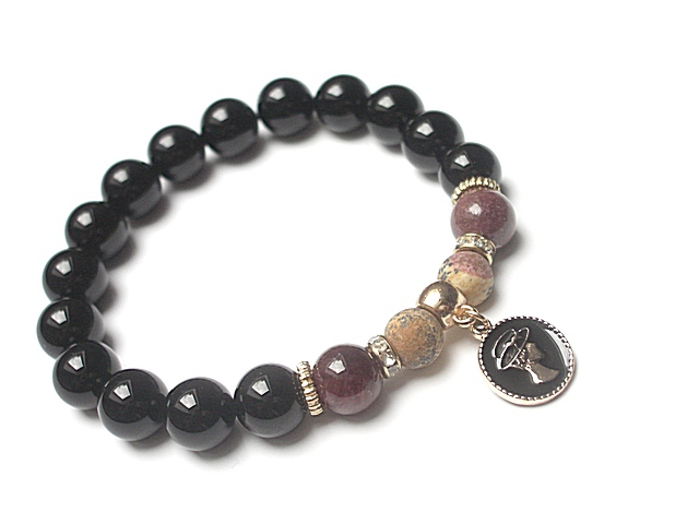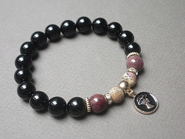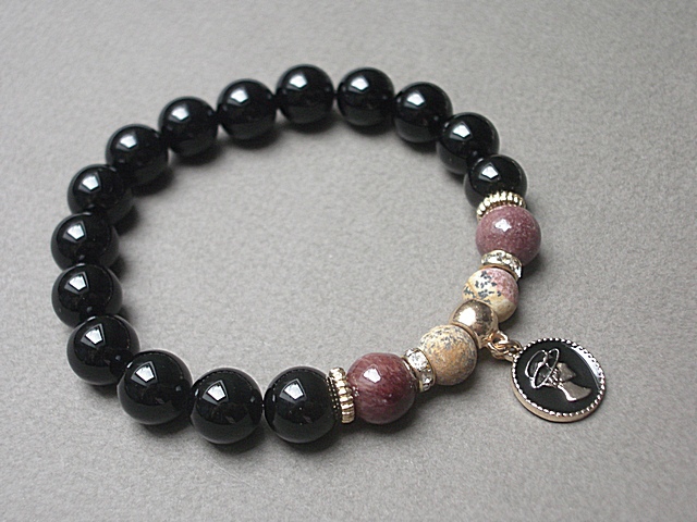 PROJEKTY AUTORSKIE. WŁASNOŚĆ KI-KA. KOPIOWANIE ZABRONIONE. Bransoletka wykonana z naturalnych kamieni - onyksy [10mm], jadeity [10mm], matowe jaspisy [8mm] oraz elementów metalowych w kolorze tzw. różowego złota. Bransoletka na gumce silikonowej. Pasuje na nadgarstek 16-17cm. Biżuteria ozdobnie zapakowana. Możliwość dopasowania bransoletki do nadgarstka - wcześniej prosimy o kontakt.