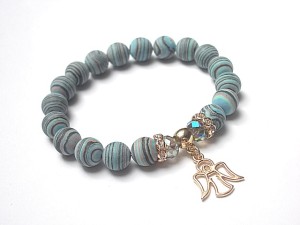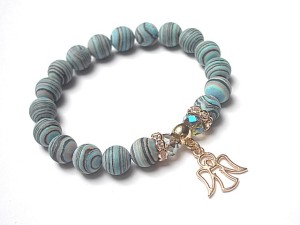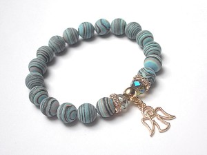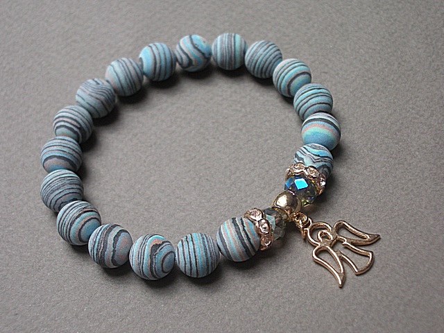 PROJEKTY AUTORSKIE. WŁASNOŚĆ KI-KA. KOPIOWANIE ZABRONIONE. Bransoletka wykonana z kuleczek prasowanych, matowych turkusów [10mm], kryształków fasetowanych [8mm] oraz elementów metalowych w kolorze tzw. różowego złota. Bransoletka pasuje na nadgarstek 16-17cm. Biżuteria ozdobnie zapakowana