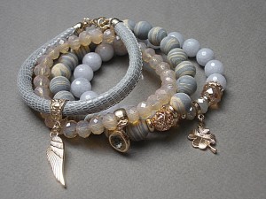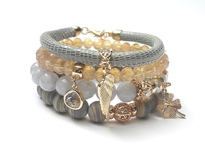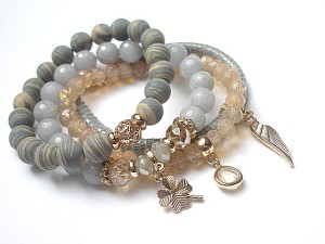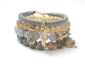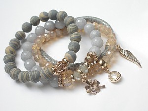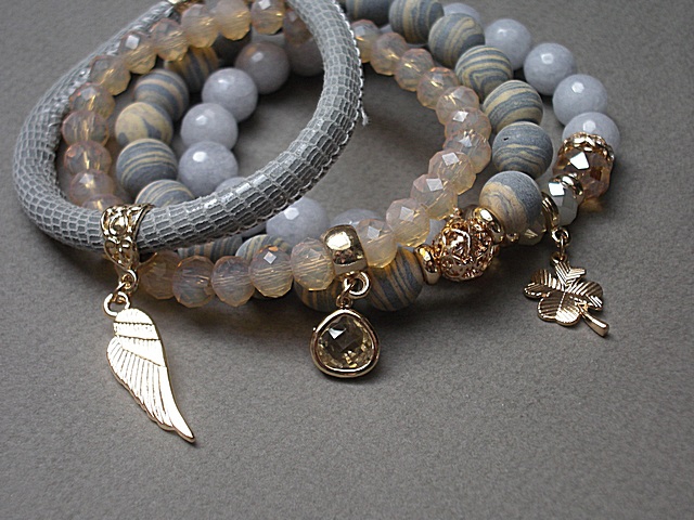 PROJEKT AUTORSKI. WŁASNOŚĆ KI-KA.. KOPIOWANIE ZABRONIONE. Komplet czterech bransoletek wykonany z kamieni - turkus rekonstruowany [10mm], jadeity fasetowane [10mm], kryształków fasetowanych [6 x 8mm i 8 x 10mm], efektownej zawieszki ze szkła, rzemienia z naturalnej, mięciutkiej skóry cielęcej [śr. 6mm] oraz elementów metalowych w kolorze złota. Pasują na nadgarstek 16-17cm. Bransoletki z kamieni i kryształków na gumce silikonowej. Biżuteria ozdobnie zapakowana