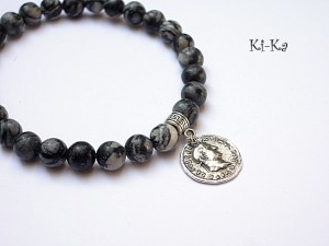 Męska bransoletka wykonana z kamieni naturalnych - jaspis [8mm], przywieszki będącej repliką starej, zabytkowej monety z okresu Cesarstwa Rzymskiego oraz elementów w kolorze srebrnym. Bransoletka na gumce silikonowej .Obwód bransoletki 20cm. Biżuteria ozdobnie zapakowana.