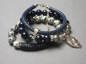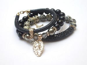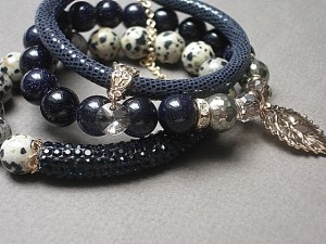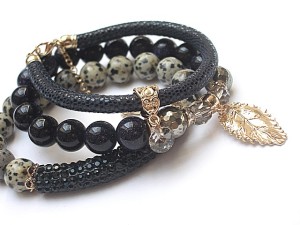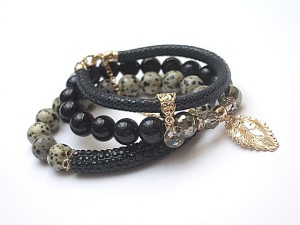 PROJEKT AUTORSKI. WŁASNOŚĆ KI-KA. KOPIOWANIE ZABRONIONE. Komplet trzech bransoletek wykonany z kamieni naturalnych: jaspis dalmatyńczyk [10mm], noc kairu [10mm], piryt fasetowany [10mm], kryształków fasetowanych [8mm], rzemienia z naturalnej, mięciutkiej skóry cielęcej [śr. 6mm], przywieszki z kryształkiem Swarovskiego [rivoli, 8mm], tunelu shamballa wysadzanego kryształkami Swarovskiego oraz elementów metalowych w kolorze tzw. różowego złota. Pasują na nadgarstek 16-17cm. Bransoletki z kamieni na gumce silikonowej. Biżuteria ozdobnie zapakowana