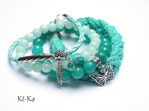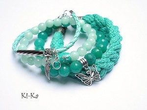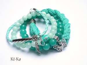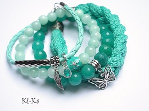 Komplet czterech bransoletek wykonanych z naturalnych minerałów: jadeity [8mm i 10mm] ,plecionego rzemienia ze skórki ekologicznej [śr.5mm] ,kryształka Swarovskiego [6mm] , dzianiny splecionej w warkocz oraz elementów metalowych w kolorze srebrnym. Bransoletki pasują na nadgarstek 16 - 17cm. Biżuteria ozdobnie zapakowana.