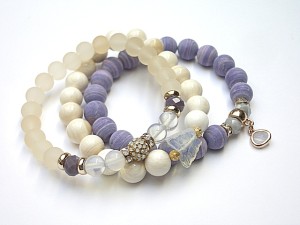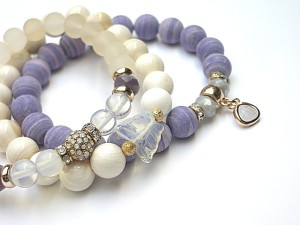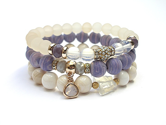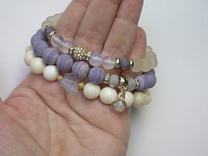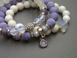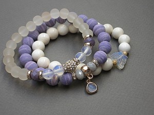 PROJEKT AUTORSKI. WŁASNOŚĆ KI-KA. KOPIOWANIE ZABRONIONE. Komplet trzech bransoletek wykonanych z kamieni - turkus prasowany, matowy [10mm], muszla [10mm], kryształków fasetowanych [6 x 8mm], szkła matowego [8mm], opalitu [8mm], efektownej zawieszki ze szkła, ekskluzywnej przekładki wysadzanej cyrkoniami, motylka z uleksytu oraz elementów metalowych w kolorze tzw. różowego złota. Bransoletki pasują na nadgarstek 16-17cm. Biżuteria ozdobnie zapakowana