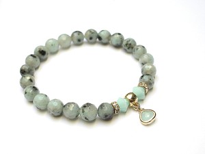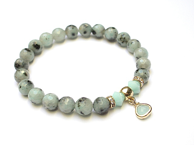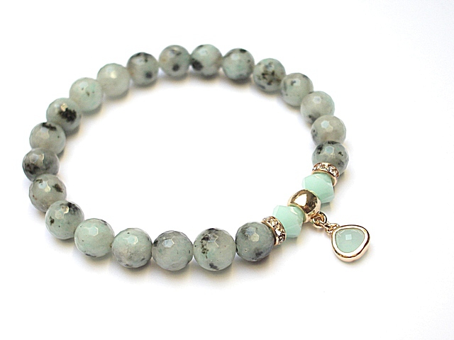 Bransoletka wykonana z fasetowanych kamieni - jaspis w kolorze miętowym [8mm], kryształków Swarovskiego [bicone 8mm], efektownej zawieszki ze szkła oraz elementów metalowych w kolorze tzw. różowego złota. Bransoletka na gumce silikonowej. Pasuje na nadgarstek 16-17cm. Biżuteria ozdobnie zapakowana