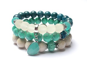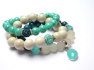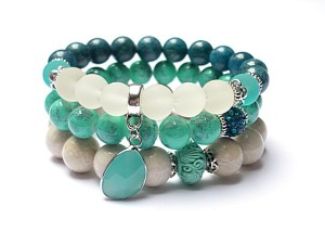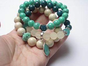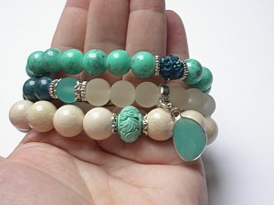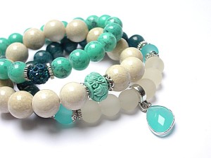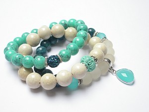 PROJEKT AUTORSKI. WSZELKIE INNE PODOBNE MODELE TO KOPIE NARUSZAJĄCE PRAWA AUTORSKIE. Komplet trzech bransoletek wykonanych z naturalnych kamieni - marmur [10 i 12mm], szkła matowego [10mm], kuleczek szklanych [10mm], przekładki z naturalnego, rzeźbionego korala, przekładki shamballa wysadzanej kryształkami Swarovskiego oraz elementów metalowych w kolorze srebra. Bransoletki pasują na nadgarstek 15,5-16,5cm . Biżuteria ozdobnie zapakowana