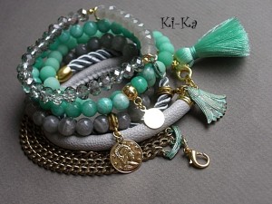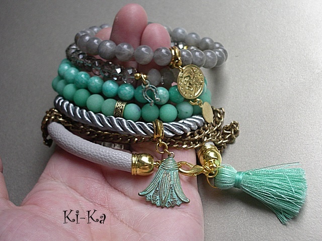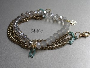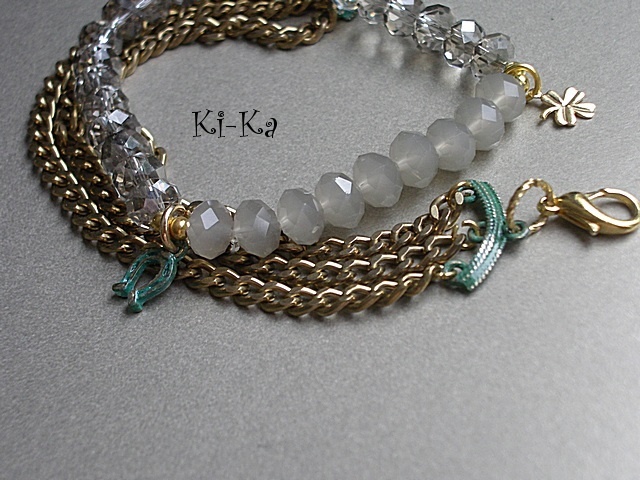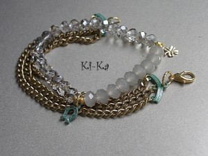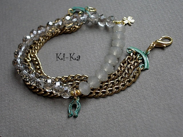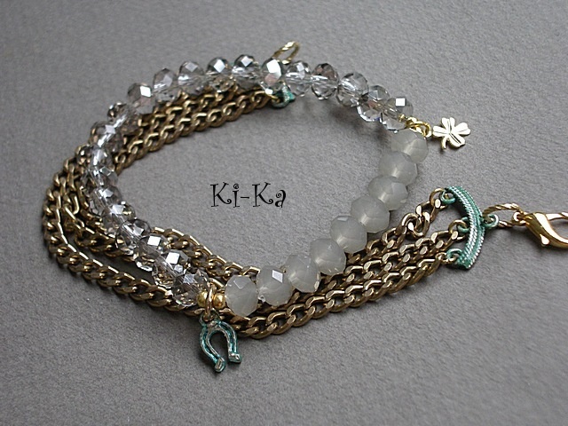 Komplet dwóch bransoletek z kryształków [szkło bardzo dobrej jakości 8mm], elementów z miedzi, które pokryłyśmy zieloną patyną oraz elementów w kolorze złota. Pasują na nadgarstek 15- 16,5cm. Bransoletka z kryształków na gumce silikonowej. Biżuteria ozdobnie zapakowana.