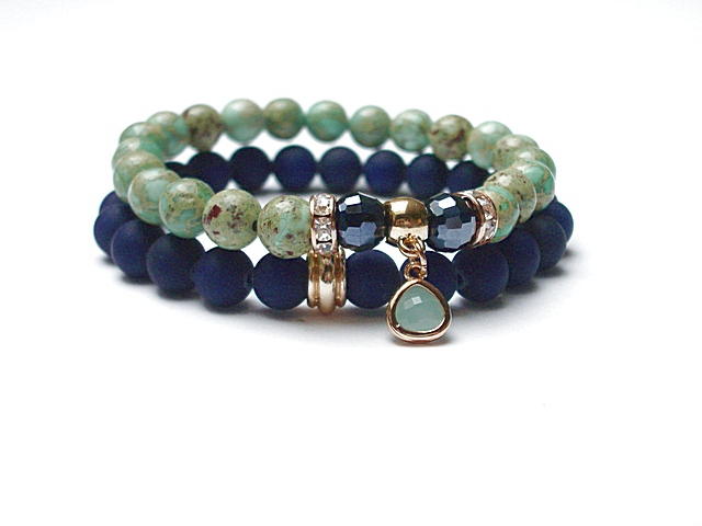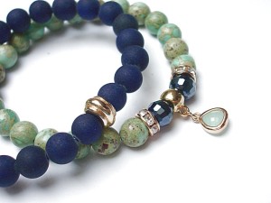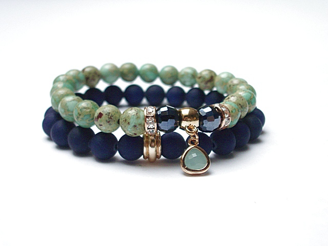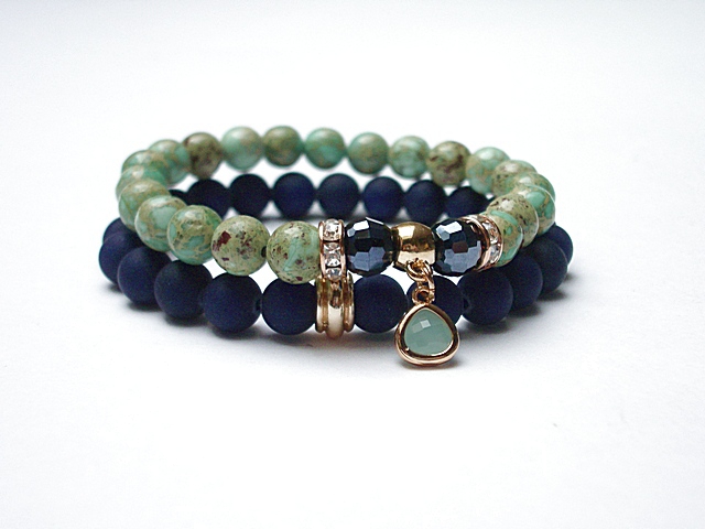PROJEKT AUTORSKI. WŁASNOŚĆ KI-KA. KOPIOWANIE ZABRONIONE. Komplet dwóch bransoletek wykonany z naturalnych kamieni - matowy jadeit [8mm] ,jaspisy [8mm], kryształki fasetowane [8mm], efektownej zawieszki ze szkła oraz elementów w kolorze tzw. różowego złota. Bransoletki na gumce silikonowej. Pasują na nadgarstek 16-17cm. Biżuteria ozdobnie zapakowana. Możliwość dopasowania bransoletki do nadgarstka - wcześniej prosimy o kontakt.
