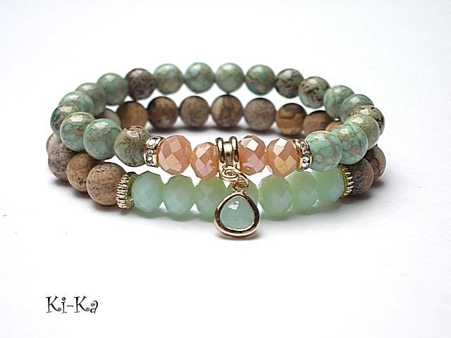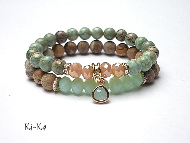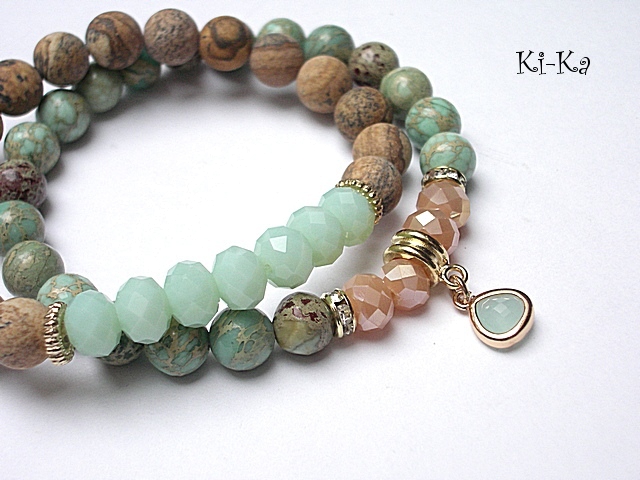 PROJEKT AUTORSKI. WŁASNOŚĆ KI-KA. KOPIOWANIE ZABRONIONE. Komplet dwóch bransoletek wykonanych z naturalnych kamieni - jaspisy [8mm], kryształków fasetowanych [6 x 8mm], efektownej zawieszki ze szkła oraz elementów metalowych w kolorze tzw. różowego złota Bransoletki na gumce silikonowej. Pasują na nadgarstek 16-17cm. W przypadku zmiany rozmiaru bransoletek prosimy o wcześniejszy kontakt. Biżuteria ozdobnie zapakowana