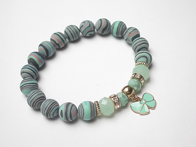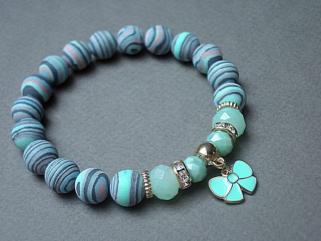 Bransoletka wykonana z kamieni - turkus prasowany, matowy [10mm], kryształki fasetowane [10 x 8 mm i 8 x 6mm] oraz z elementów metalowych w kolorze tzw. różowego złota. Bransoletka na gumce silikonowej. Będzie pasowała na nadgarstek 16-17cm. Biżuteria ozdobnie zapakowana.