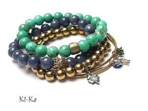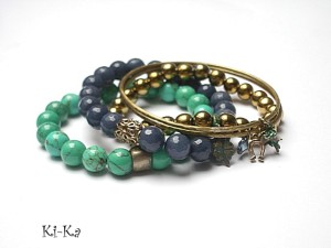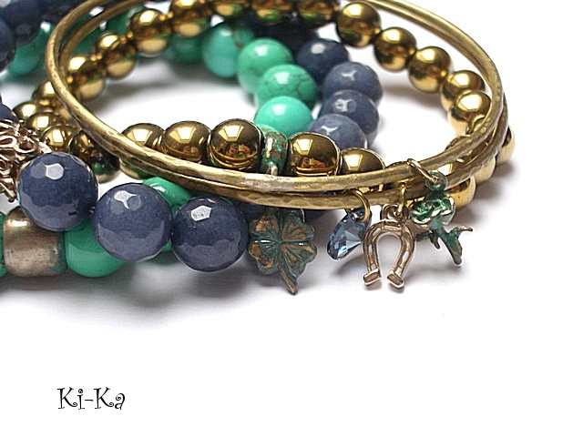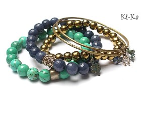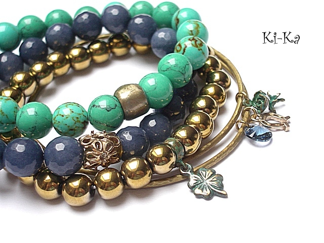 PROJEKT AUTORSKI. WŁASNOŚĆ KI-KA Komplet pięciu bransoletek wykonanych z naturalnych kamieni: jadeity fasetowane [10mm], howlit [10mm], hematyt [8mm], ręcznie wykonane młotkowane obręcze z mosiadzu, elementów z brązu, przywieszki z kryształkiem Swarovskiego. Część elementów poddałyśmy procesowi patynowania na kolor miętowy dla uzyskania efektu postarzenia, efektu vintage. Bransoletki pasują na nadgarstek 17 - 18cm. Biżuteria ozdobnie zapakowana