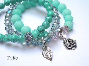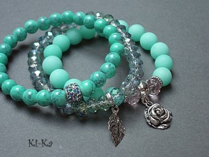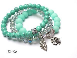 Komplet trzech bransoletek wykonany z kamieni naturalnych - jadeity matowe [10mm], kryształków [8 x 6mm], szkła [8mm], przekładki wysadzanej kryształkami oraz elementów w kolorze srebra Pasują na nadgarstek 15,5-16,5cm. Bransoletki na gumce silikonowej. Biżuteria ozdobnie zapakowana