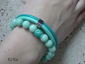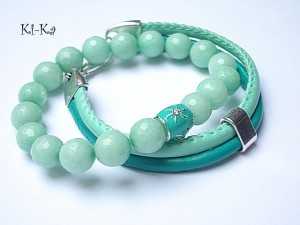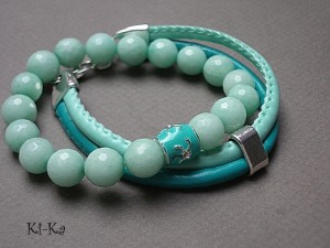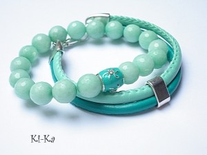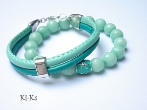 Komplet dwóch bransoletek wykonanych z naturalnych kamieni: fasetowane jadeity [10mm] , rzemienia z ekologicznej skórki [śr,6mm] oraz elementów metalowych w kolorze srebrnym. Bransoletki pasują na nadgarstek 16-17cm. Biżuteria ozdobnie zapakowana.
