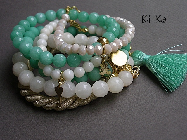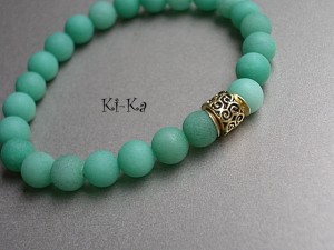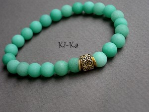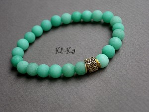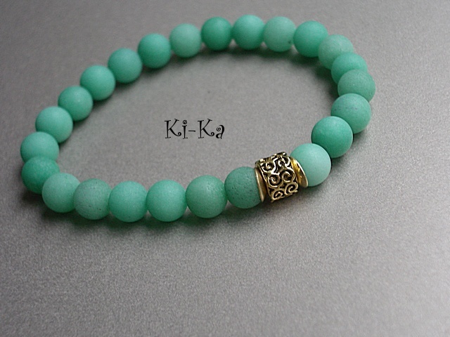 Bransoletka wykonana z naturalnych minerałów [jadeit matowy 8mm] oraz elementów w kolorze złota. Pasuje na nadgarstek 15,5- 16,5cm. Bransoletka na gumce silikonowej. Biżuteria ozdobnie zapakowana. Bransoletka może stanowić komplet z innymi bransoletkami dostępnymi w naszej galerii - przykładowe zdjęcia.