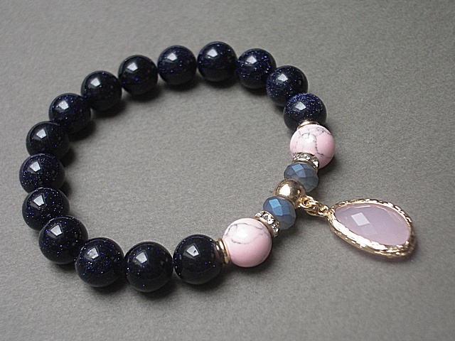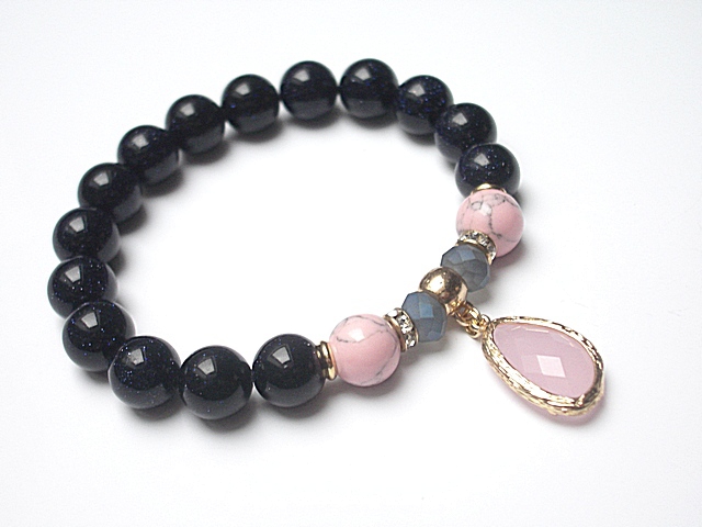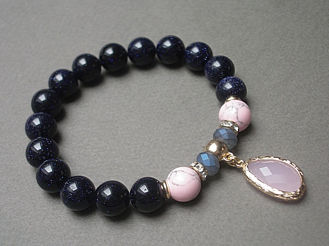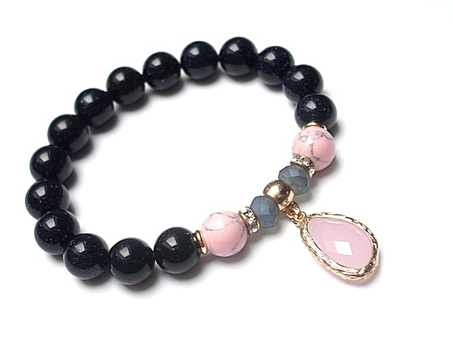 Bransoletka wykonana z kuleczek nocy kairu [10mm], howlitów [10mm], kryształków [8mm], przywieszki w okuciu oraz elementów w kolorze tzw. różowego złota. Pasuje na nadgarstek 16-17cm [możliwość dopasowania]. Biżuteria ozdobnie zapakowana. PROJEKTY AUTORSKIE