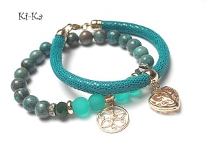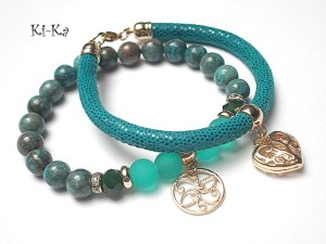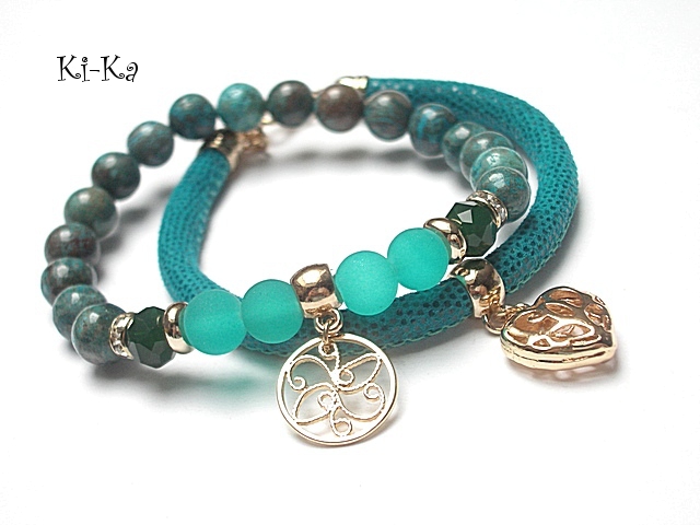 PROJEKT AUTORSKI. WŁASNOŚĆ KI-KA. KOPIOWANIE ZABRONIONE. Komplet dwóch bransoletek wykonanych z naturalnych kamieni - kuleczki jaspisów [8mm] ,kryształki [8mm] ,szklane matowe kuleczki [8mm] ,rzemienia z mięciutkiej koziej skórki [6mm] oraz elementów metalowych w kolorze tzw.różowego złota.Bransoletki pasują na nadgarstek 16-17cm. Biżuteria ozdobnie zapakowana