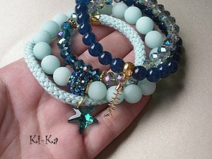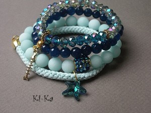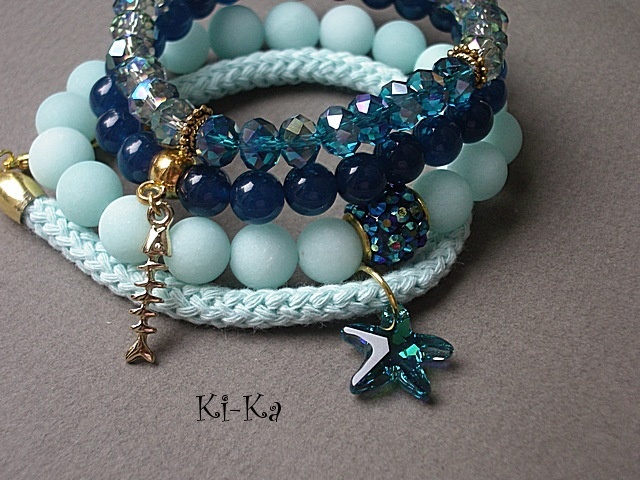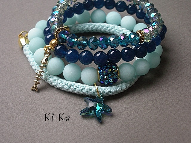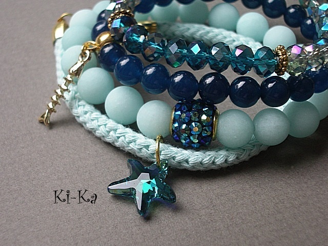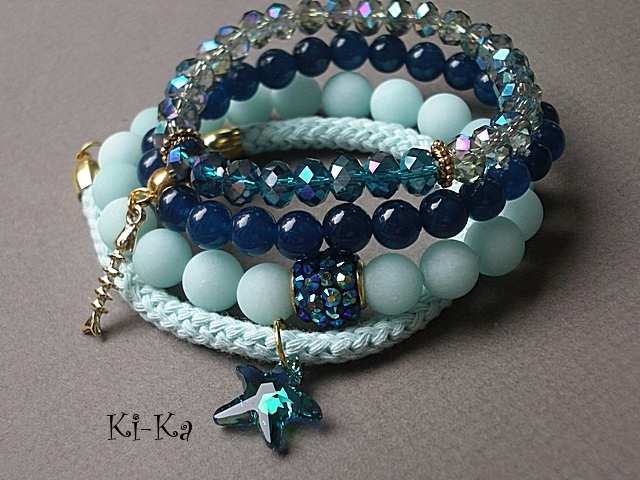 Komplet czterech bransoletek wykonanych z naturalnych minerałów: jadeity [6mm i 10mm] ,fasetowane szklane kryształki [7mm] ,sznurka z dzianiny, kryształka Swarovskiego w kształcie rozgwiazdy oraz elementów w kolorze złotym. Bransoletki będą pasowały na nadgarstek 15,5-16,5cm. Biżuteria ozdobnie zapakowana .