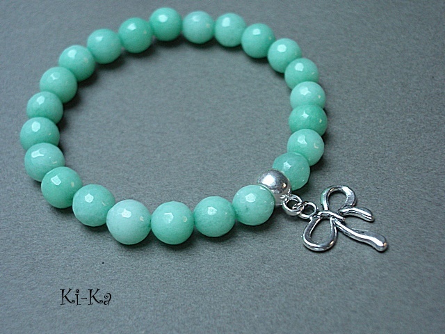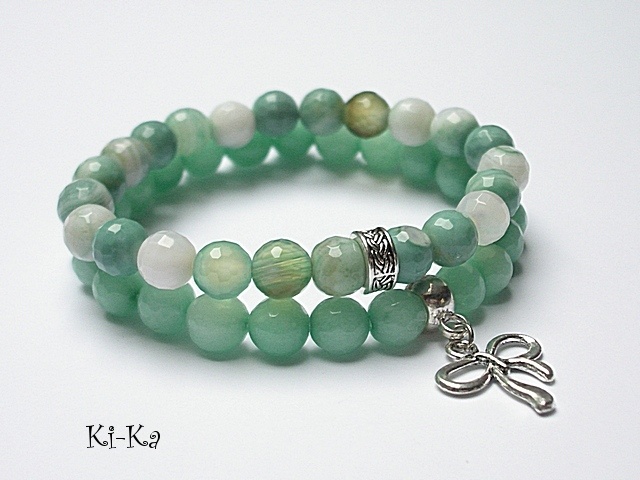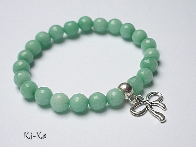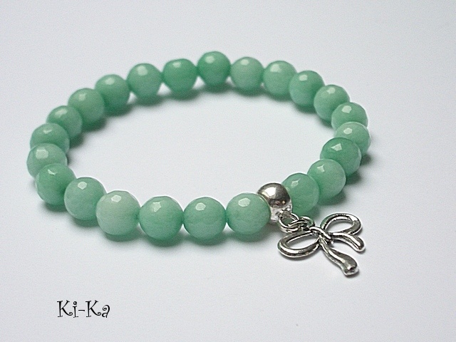 Bransoletka wykonana z kamieni naturalnych -fasetowane jadeity [8mm] oraz elementów w kolorze srebrnym. Pasuje na nadgarstek 15 -16,5cm. Bransoletka na gumce silikonowej. Biżuteria ozdobnie zapakowana.