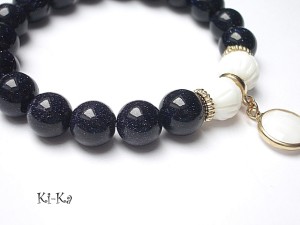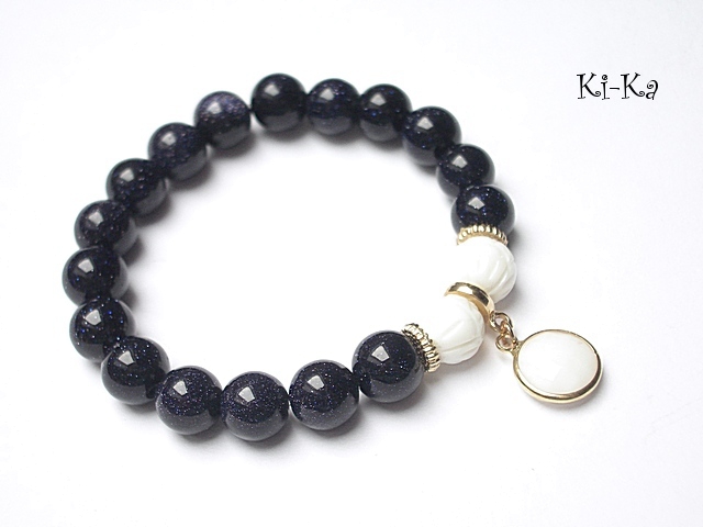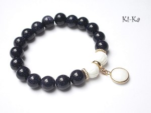 PROJEKT AUTORSKI. KOPIOWANIE ZABRONIONE Bransoletka wykonana z kuleczek nocy kairu [10mm] ,rzeźbionej muszli [10mm] ,efektownej zawieszki z mosiądzu ,platerowanej oraz elementów metalowych w kolorze tzw. różowego złota. Bransoletka na gumce silikonowej. Pasuje na nadgarstek 16-17cm. Biżuteria ozdobnie zapakowana. Możliwość dopasowania bransoletki do nadgarstka - wcześniej prosimy o kontakt